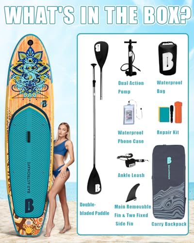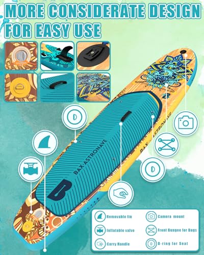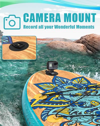 VERSATILE USE: Ideal for oceans, lakes, and rivers, this paddle board suits various activities like yoga, surfing, exploring, and fishing. It features 6 bungee cords for gear and a Action Camera base to capture your adventures