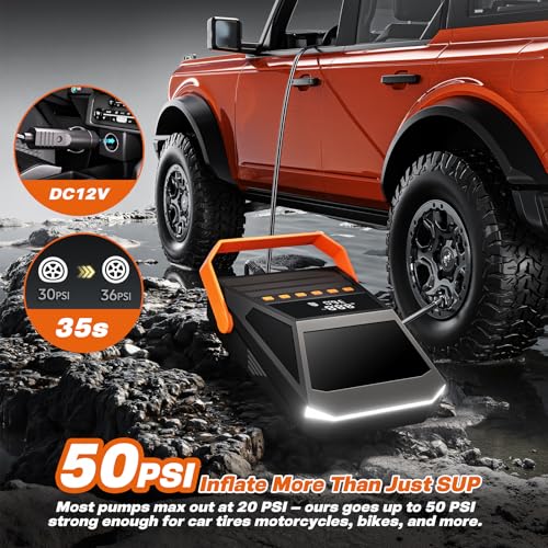 Up to 50 PSI Maximum Pressure – This electric paddle board pump delivers a powerful 50 PSI of maximum pressure, making it perfect not only for your stand up paddle board but also for a variety of inflatable items such as car tires, motorcycles, and air mattresses. Its high pressure capacity sets it apart from other paddle board inflator pumps, ensuring faster and more efficient inflation for all your outdoor adventures