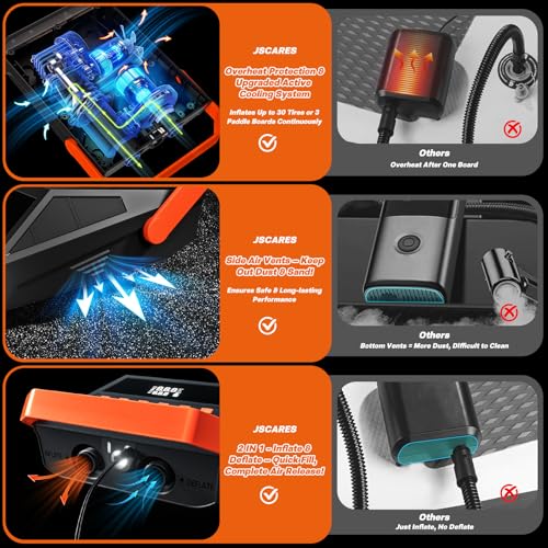 Efficient Cooling System & Overheat Protection – The electric paddle board pump is equipped with a highly efficient cooling system, featuring internal and external cooling vents. This allows the pump to run continuously for up to 30 minutes without overheating, ensuring a safe and reliable inflation process. The overheat protection feature automatically pauses the pump if temperatures rise too high, so you can rest easy while using your paddle board inflator pump for extended periods