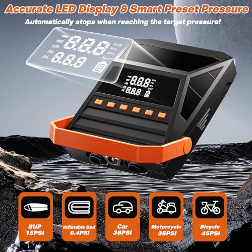 5 Preset Modes & Custom PSI Adjustment for Maximum Flexibility – Our SUP pump electric features 5 preset modes, including SUP mode (15 PSI), inflatable bed mode (0.4 PSI), car tire mode (36 PSI), motorcycle mode (35 PSI), and bike mode (45 PSI). Plus, you can easily adjust the PSI to fit your unique needs. Whether you’re inflating a paddle board, kayak, or tire, this electric air pump for paddle board makes it simple to get the right pressure every time