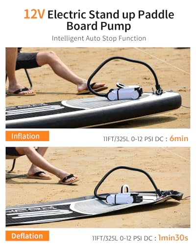 22 PSI Quick electric pump:With dual motors start inflation together, Powerful electric paddleboard pump can inflate a inflatable surfboard from 0 to 12 PSI in 6 minutes. Up to 15 PSI in 8mins.